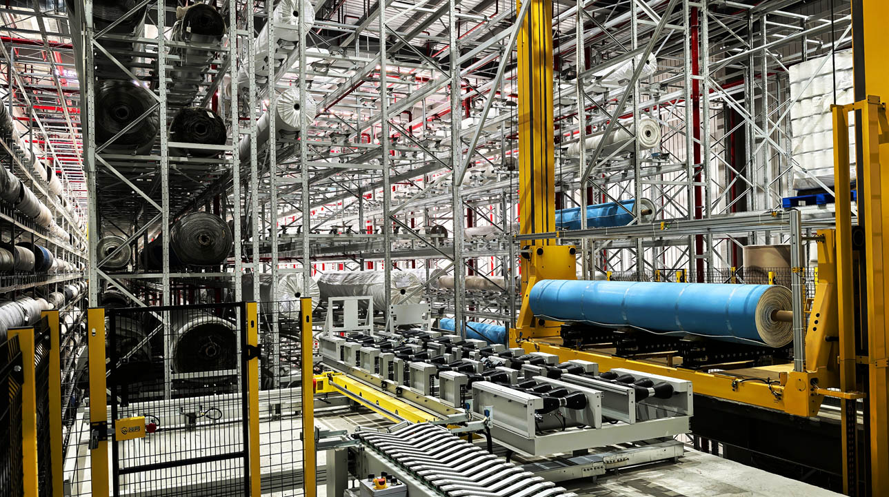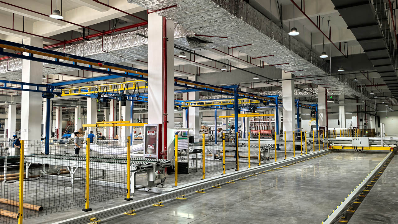 鴻成為國內首家立庫與產線深度結合的地毯制造商,通過現場WCS,WMS,與我們自主研發的生產控制軟件,我們實現了95%的產線物料進與出相關的自動化,包括簇絨,印花,方塊地毯的自動上下料,下機檢驗的自動輸送線,KBK支架等。