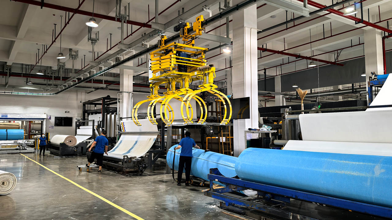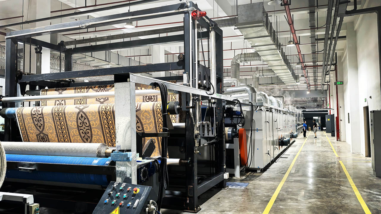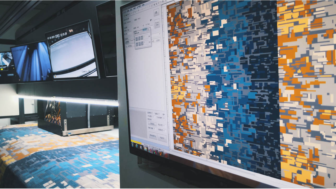 現公司共有8臺簇絨織機,可為方塊地毯,滿鋪地毯及家具塊毯織造不同毯面,未來總規劃共可放置13臺簇絨織機,簇絨車間內物流均采用高級AGV系統。