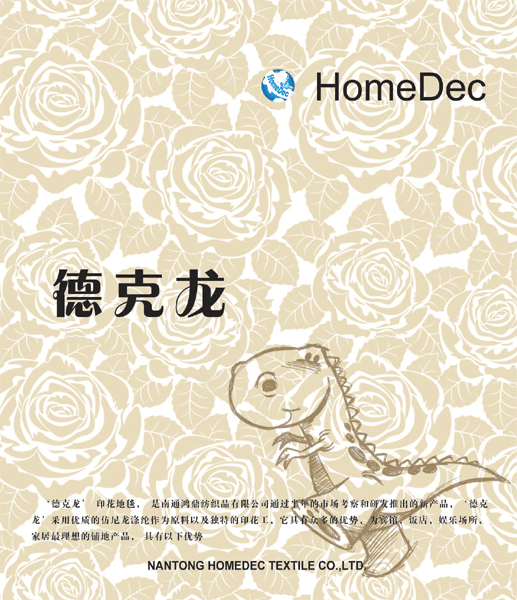 尼龍印花是公司較早開發(fā)和成熟的產(chǎn)品, 目前我們對各類克重和寬幅的尼龍印花均有坯毯備貨,可以隨時生產(chǎn),隨時交貨, 如果從公司圖庫中選擇圖案生產(chǎn), 交貨期會更快。