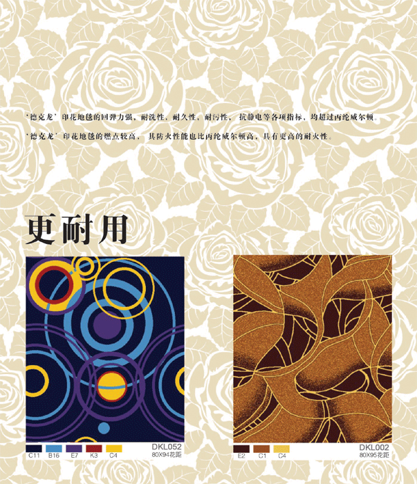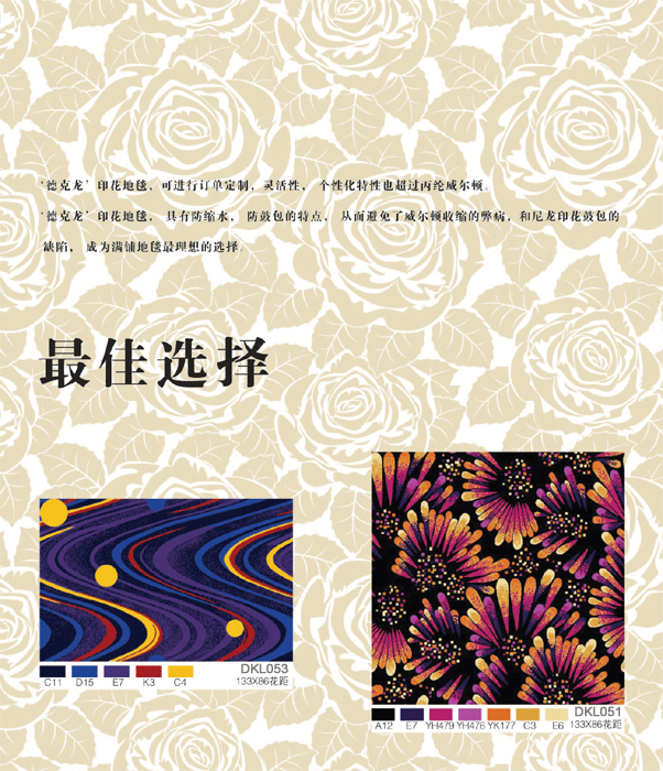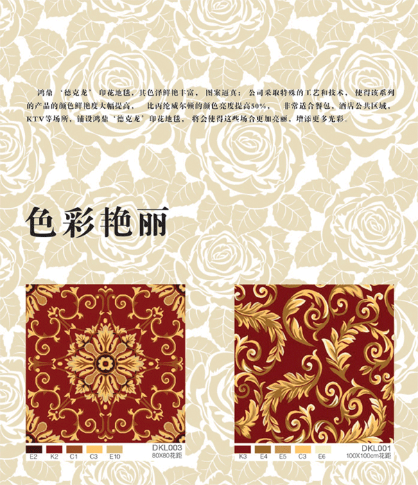 尼龍印花具有色澤鮮艷, 回彈力好, 使用壽命長, 易清洗等優(yōu)點, 深受高端酒店的青睞。